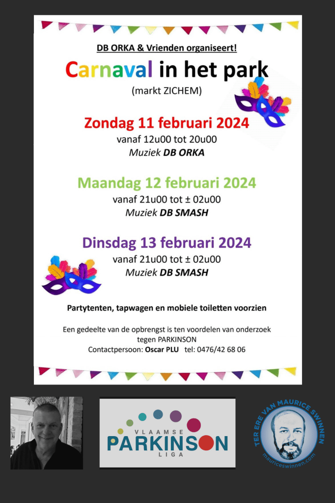‘Ter Ere Van Maurice Swinnen’ gaat Oscar Plu en zijn ‘Carnaval in het Park’ sponsoren in Zichem op 11, 12 en 13 februari 2024. Een gedeelte van de opbrengst gaat naar de Parkinson Liga. Ik ben niet de enige sponsor. Dit is een heel mooi voorbeeld hoe Scherpenheuvel-Zichem samenkomt om elkaar te steunen. Hageland Expres zette het in de kijker.